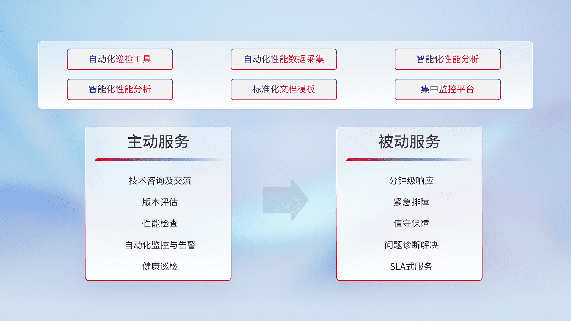 智能化工具和标准化文档,,保障服务质量,,,提供主动服务(包含技术咨询、、版本评估、、、性能检查、、自动化监控与告警、、、健康巡检)和被动服务包含(分钟级响应、、、、紧急排障、、、、值守保障、、问题诊断解决、、、、SLA服务)。。
